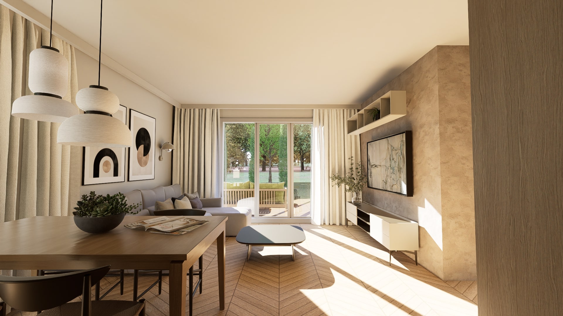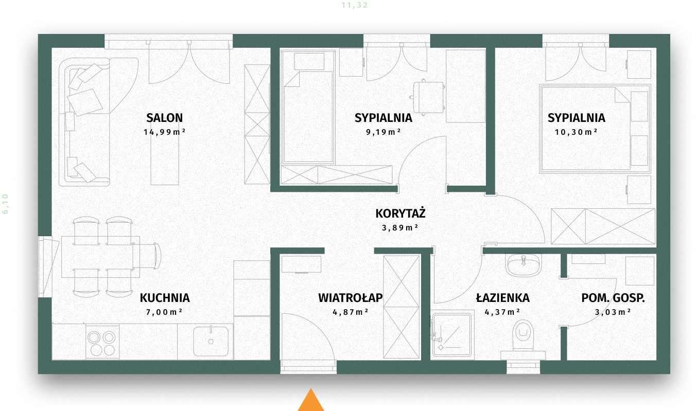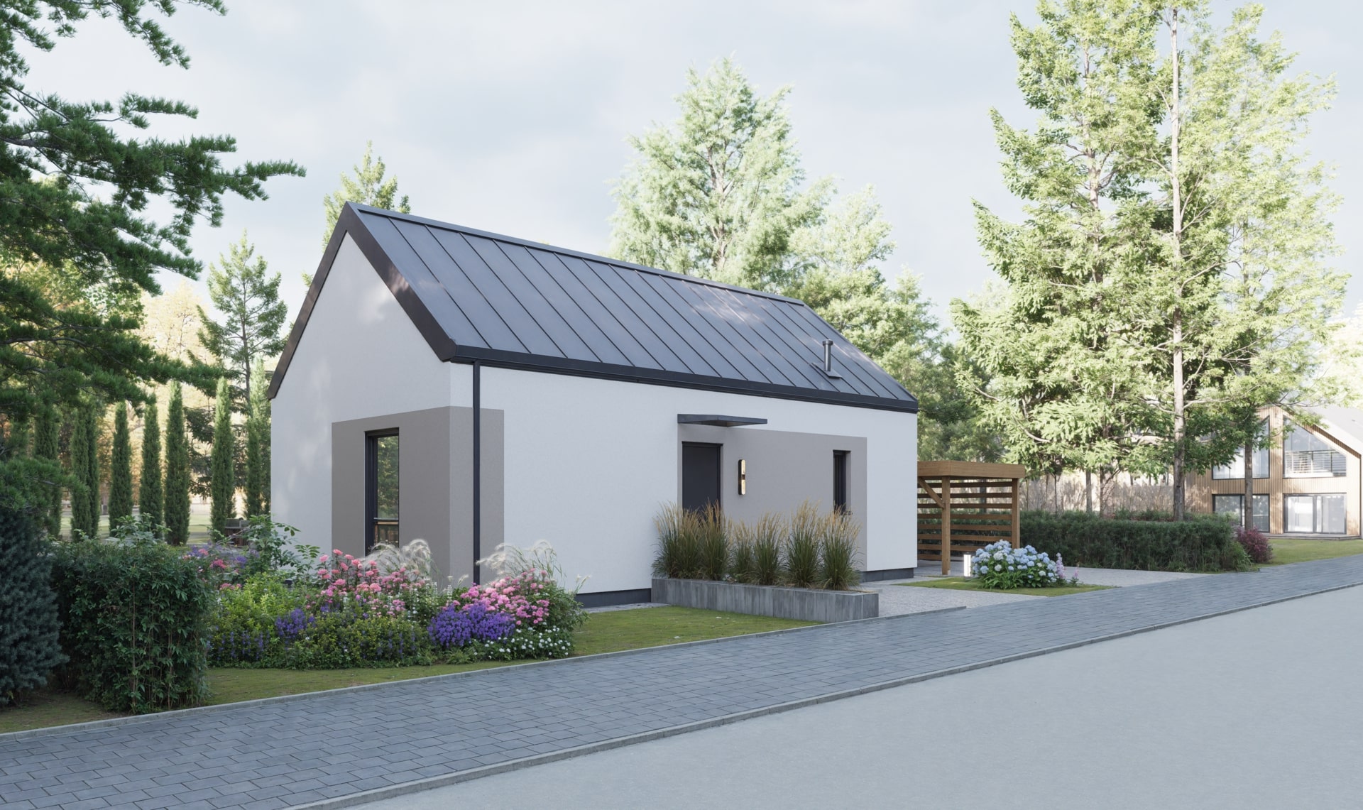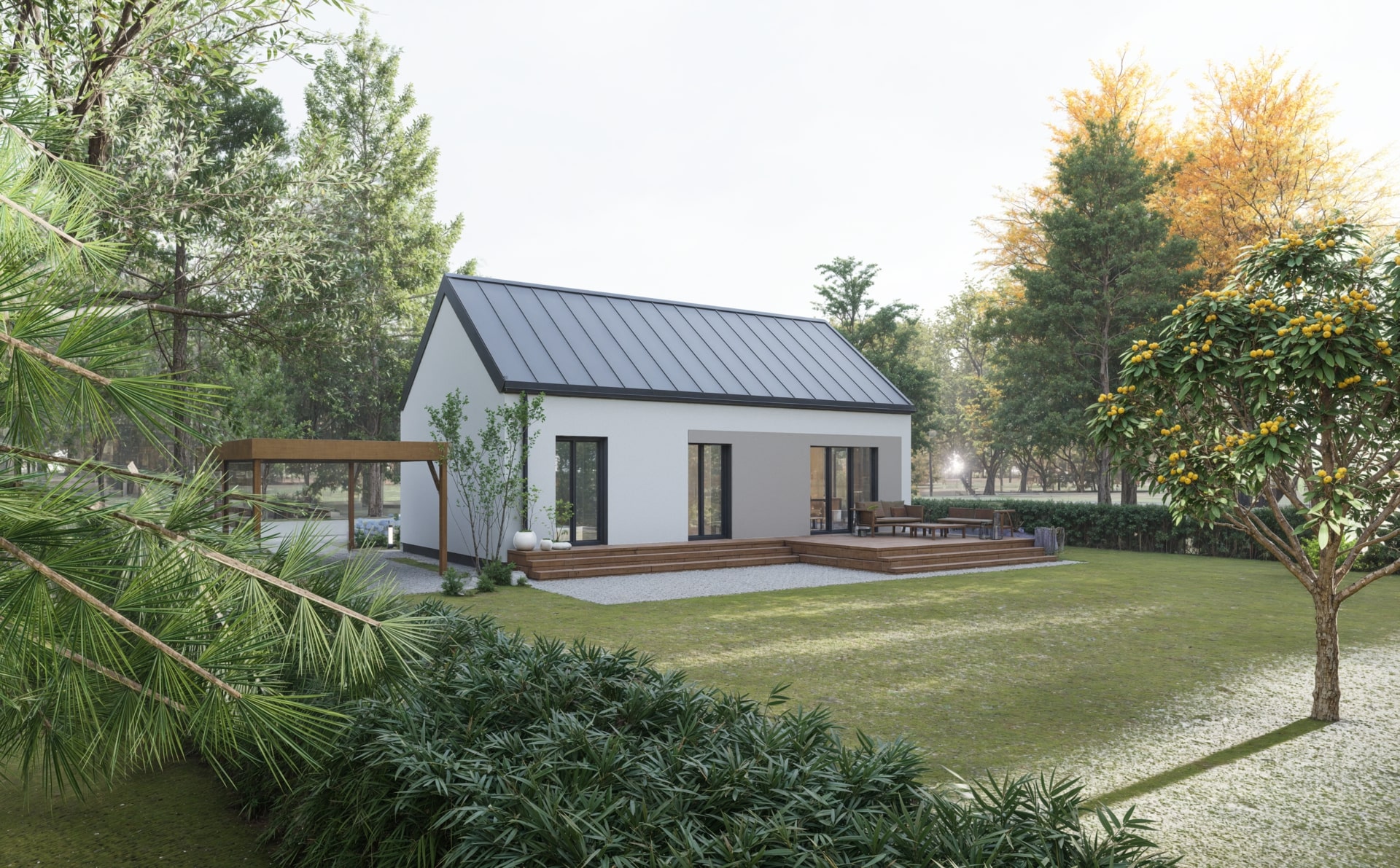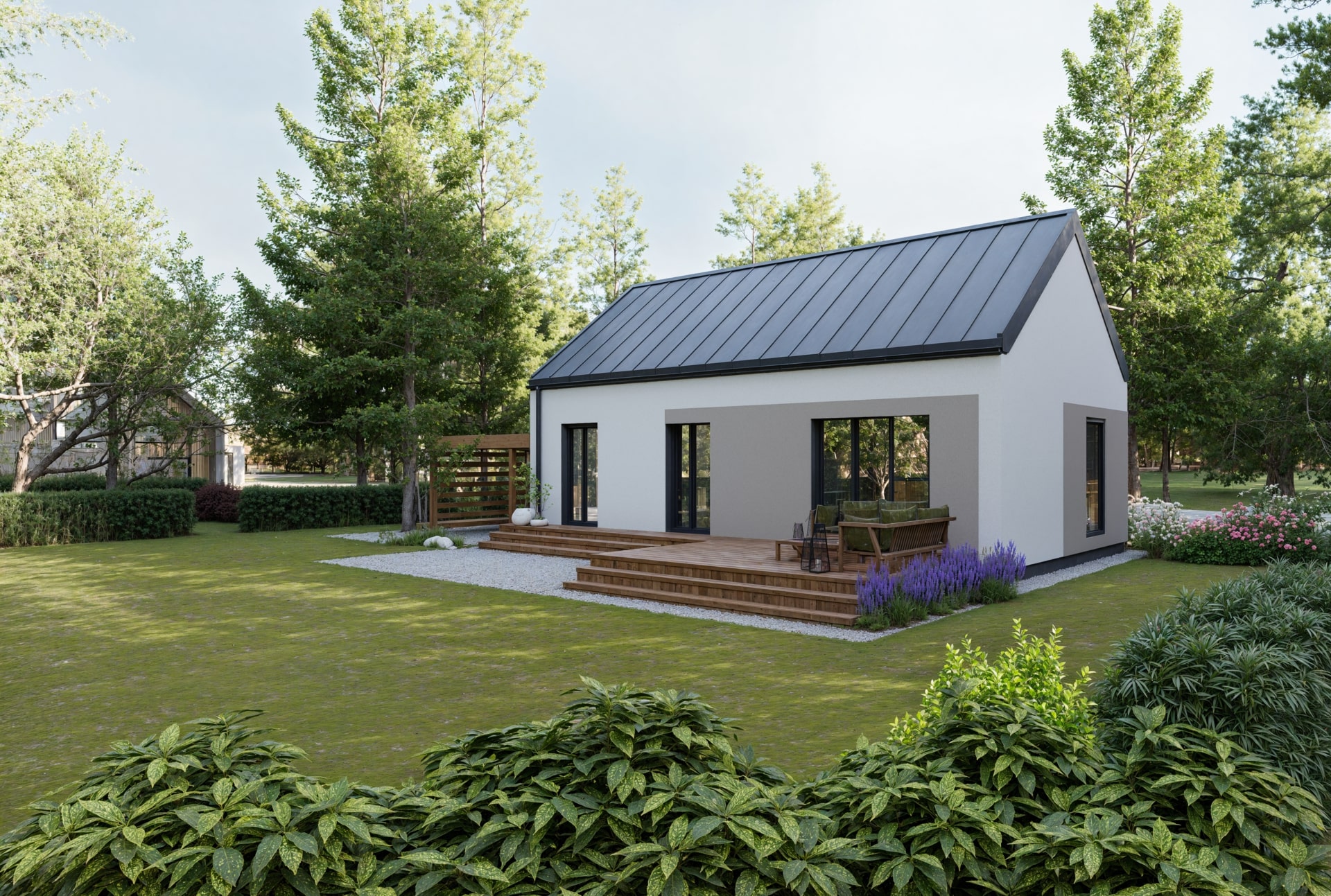Dom modułowy Rolig 70 to komfortowa przestrzeń, która sprawdzi się na każdym etapie życia. Parterowy układ ułatwia codzienne funkcjonowanie, a ogród dostępny bezpośrednio z salonu i obu sypialni zachęca do spędzania czasu na świeżym powietrzu.