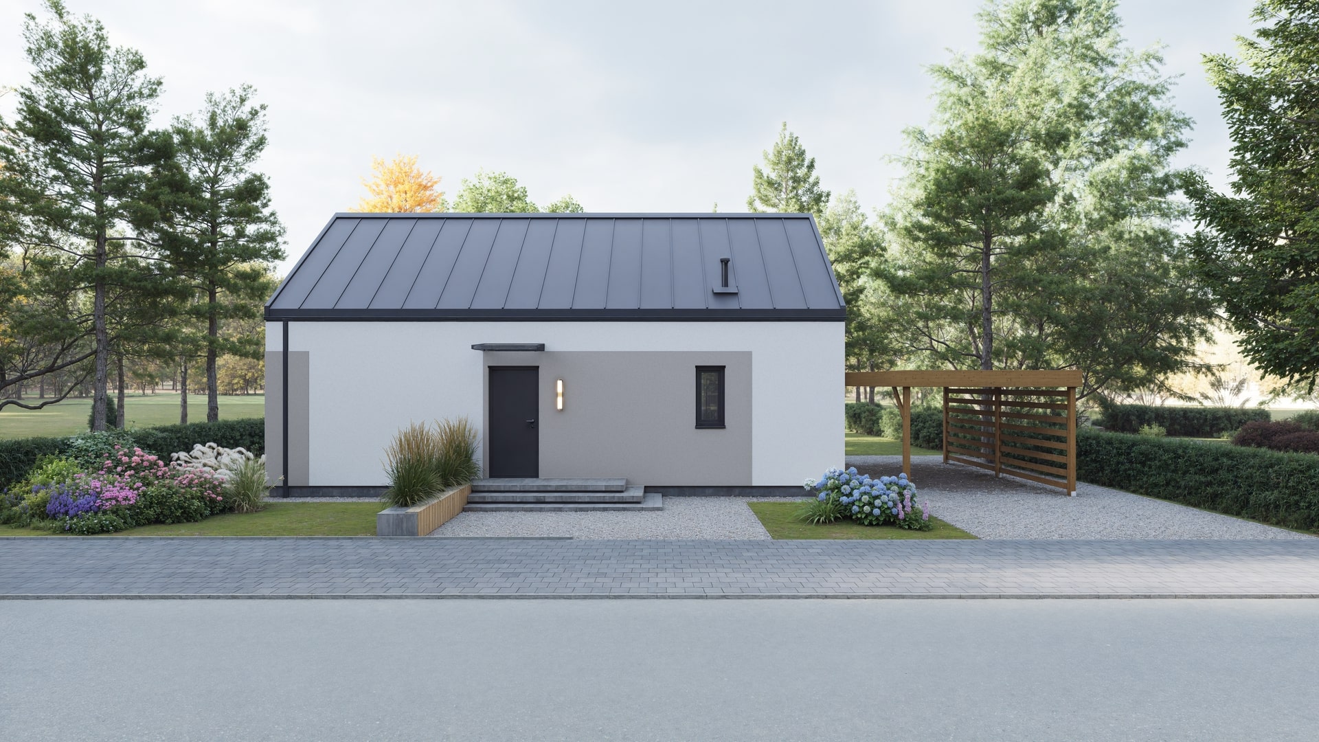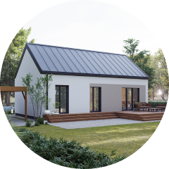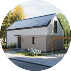 Dom modułowy Rolig 70 to kompaktowy, parterowy budynek w stylu nowoczesnej stodoły. Prosta bryła, jasna elewacja i dwuspadowy dach sprawiają, że dom jest funkcjonalny i ponadczasowy.